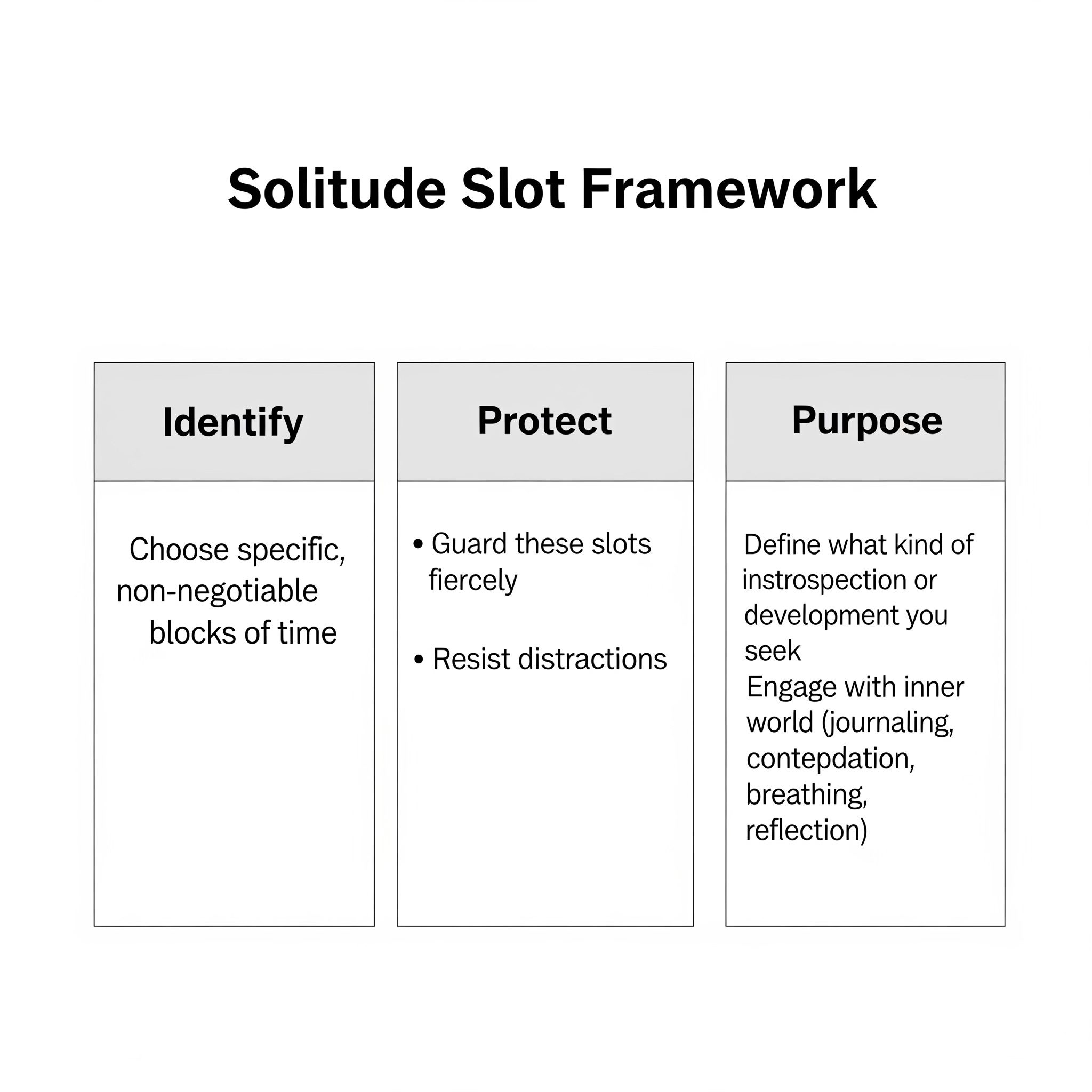 To effectively transform time into a canvas for growth, we can adopt what I call the "Solitude Slot Framework." This framework has three key pillars: Identify, Protect, and Purpose.